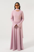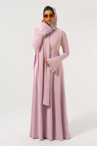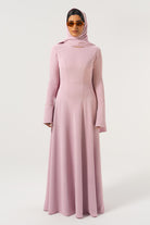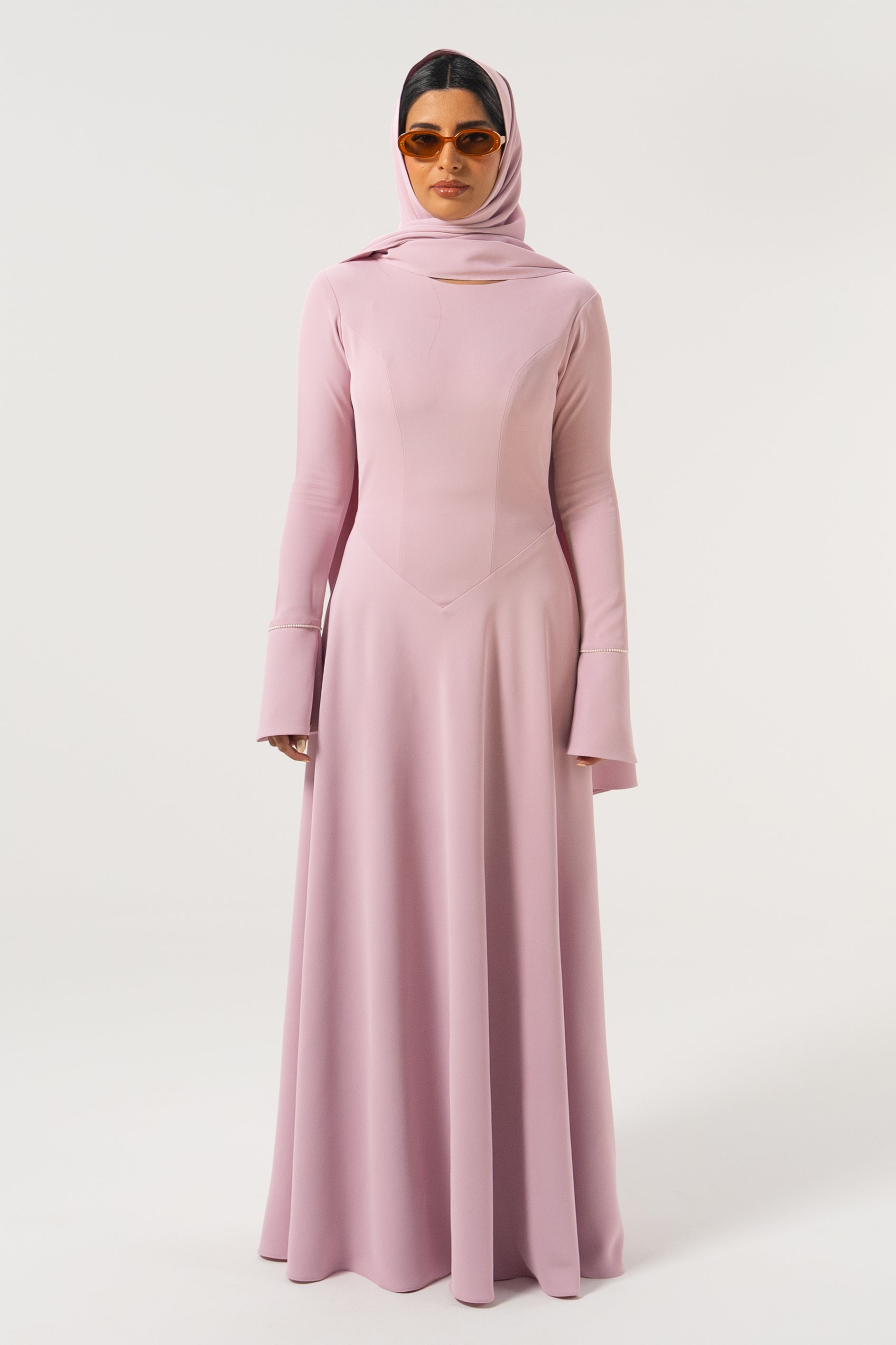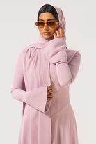 This silky crepe dress was designed to make the trendiest modern styles accessible to modest girls. She’s a full-coverage, high neck dress with a gorgeous, voluminous flared skirt that will make you want to never stop twirling like a girly girl. The most special thing about her is the subtle pearl detailing along the flared cuff which elevates the dress to another level. Wherever you go wearing this dress, be prepared to turn heads. Comes with an additional scarf.