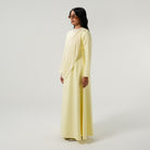 The most flattering modest dress with a chiffon cape hand-embroidered with pearls. This dress has been designed to elevate a classic cape dress into an unforgettable asymmetrical, pleated moment falling into soft cowls looking ever so ethereal. It’s meant to stun with the most gracious shape to give you comfort in its modesty while being otherworldly in its beauty.