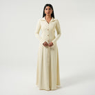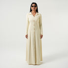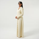 The perfect buttercream, collared, flared maxi dress to take you from day to night. Designed to be the ultimate smart casual dress with a unique curved cuff and faux gold buttons, this dress is more than just an elevated basic. She is the epitome of timeless chic. Style with gold statement earrings and a pair of Le Specs for the most unmatched, snatched day look you could ever ask for.