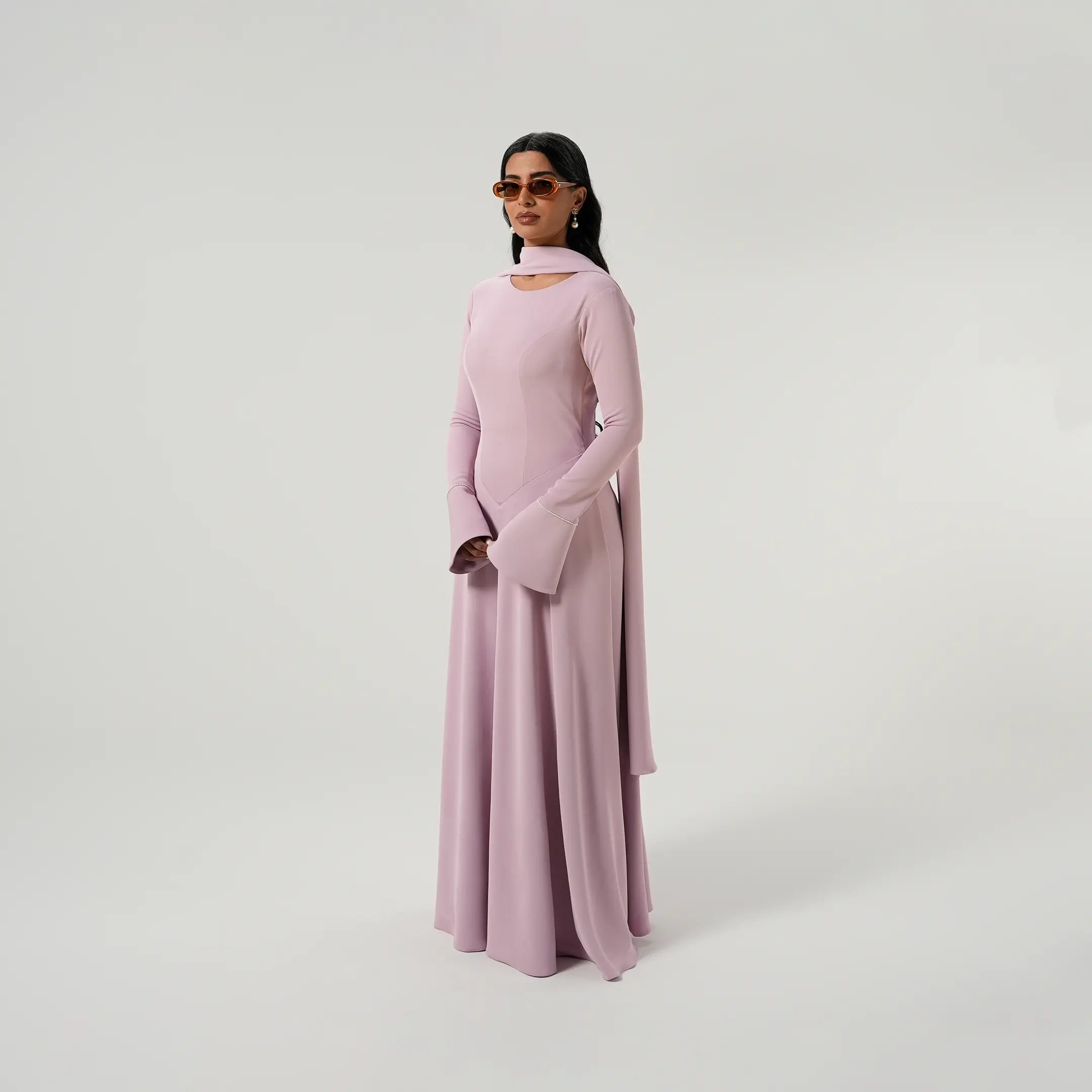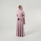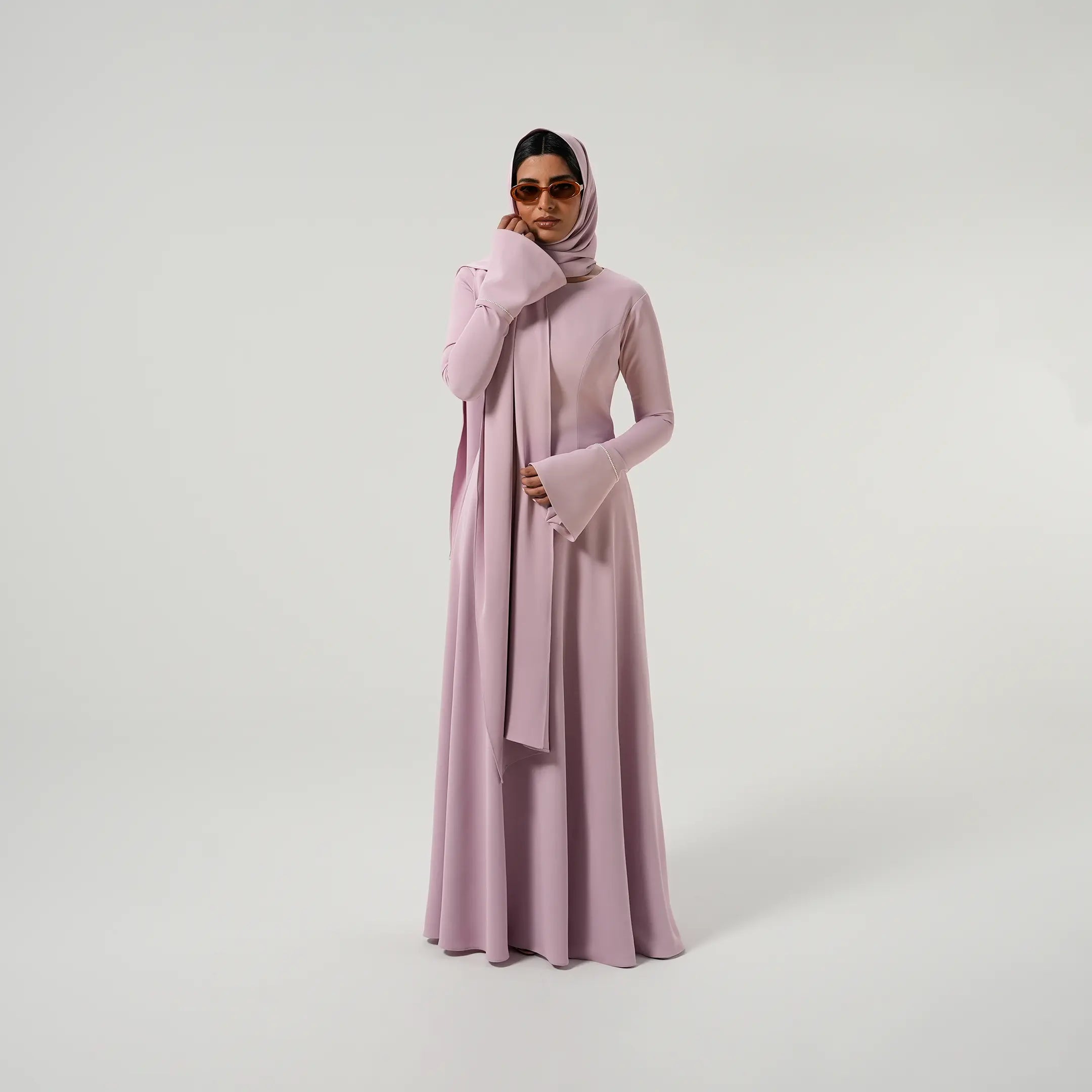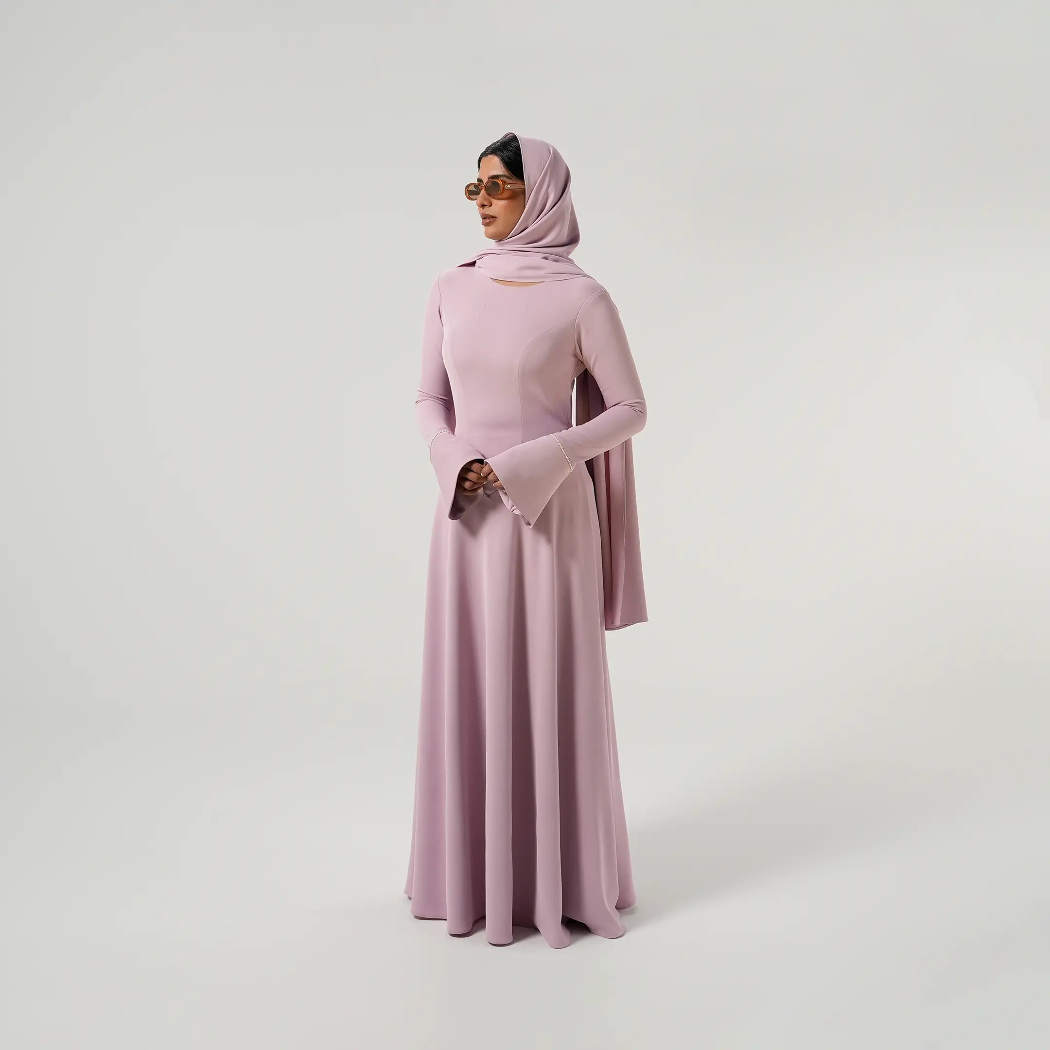 A study in modern modesty. Fully covered. Tailored through the bodice. Finished with a voluminous skirt and pearl-detailed cuffs. Designed for presence. Includes a coordinating scarf.
