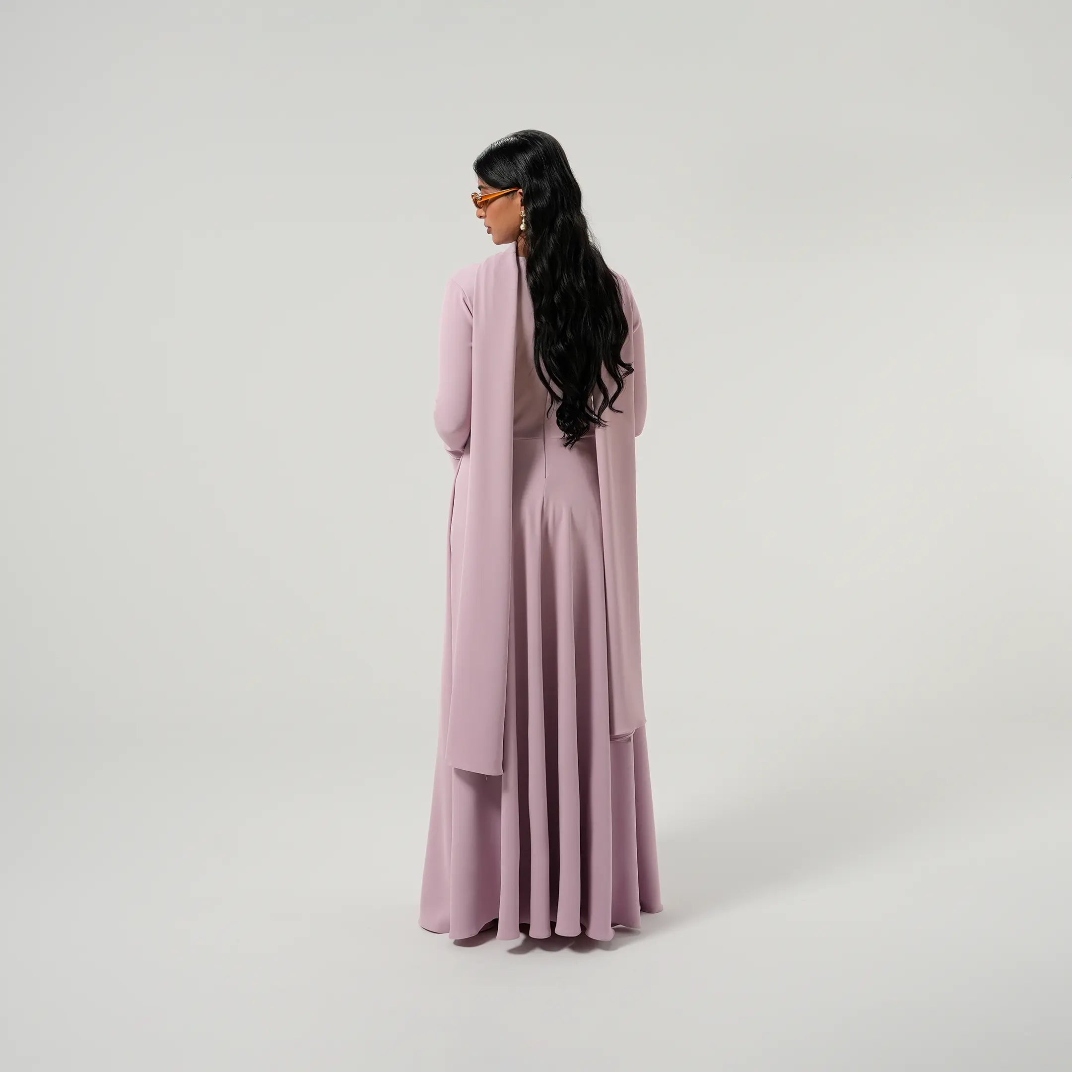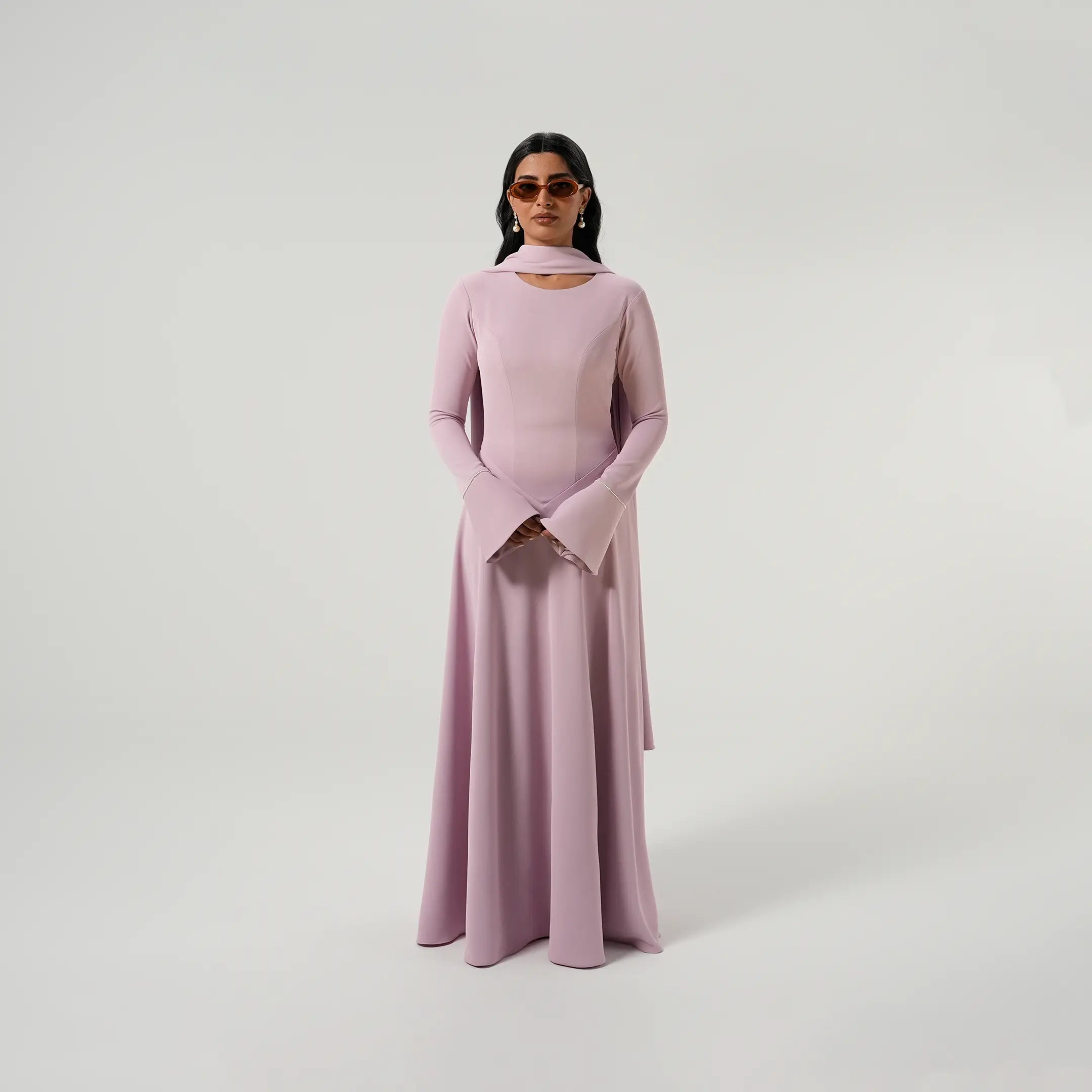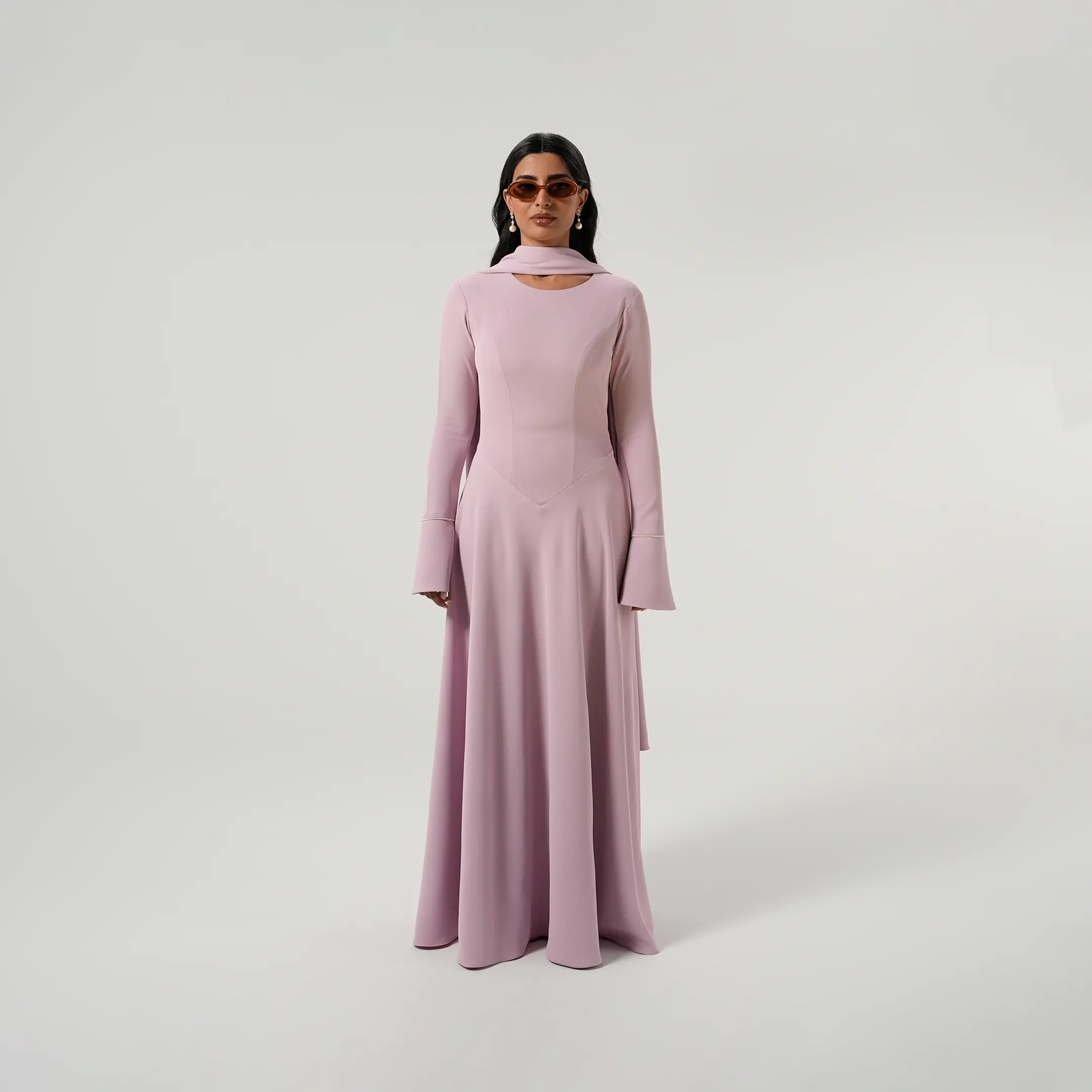 A study in modern modesty. Fully covered. Tailored through the bodice. Finished with a voluminous skirt and pearl-detailed cuffs. Designed for presence. Includes a coordinating scarf.