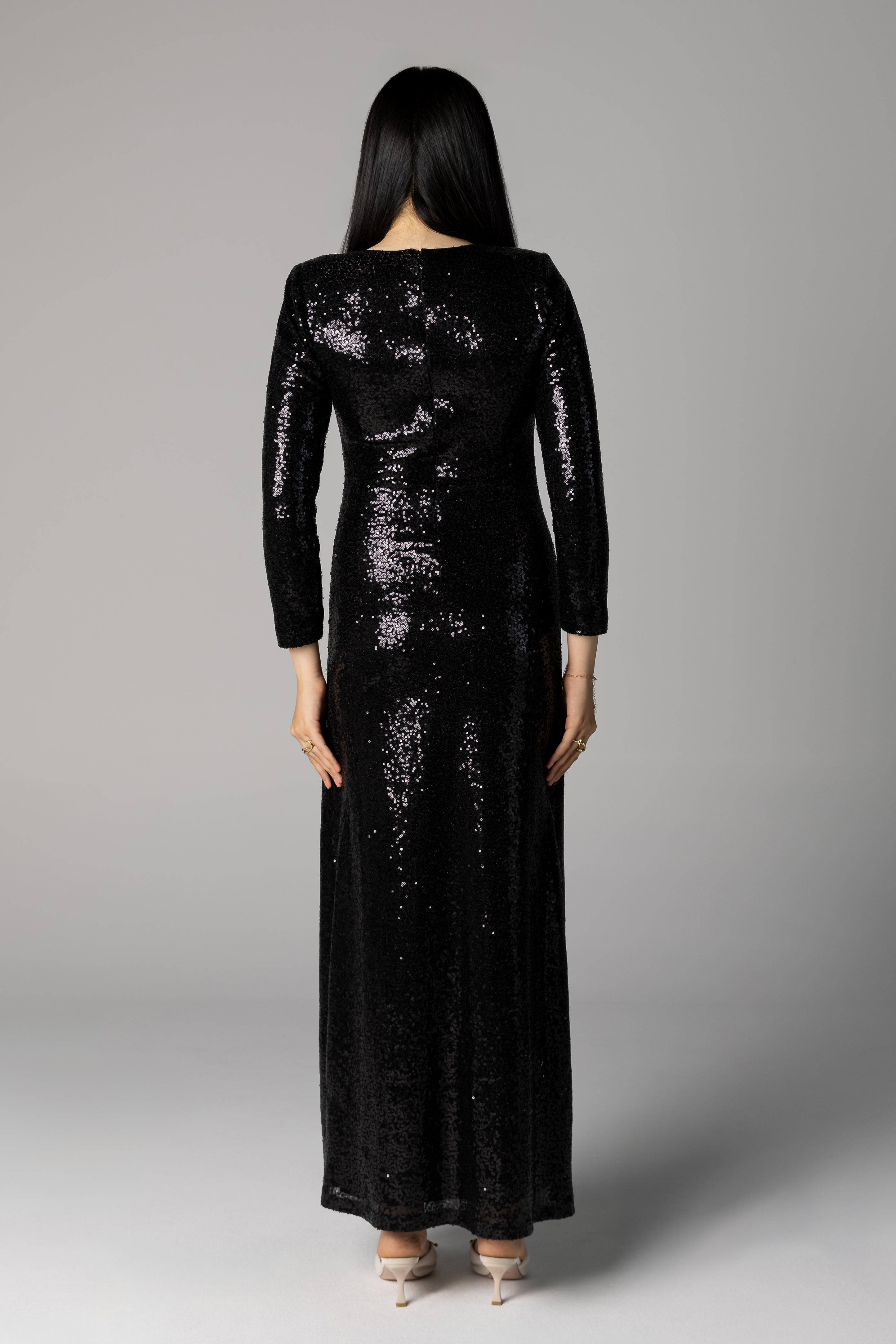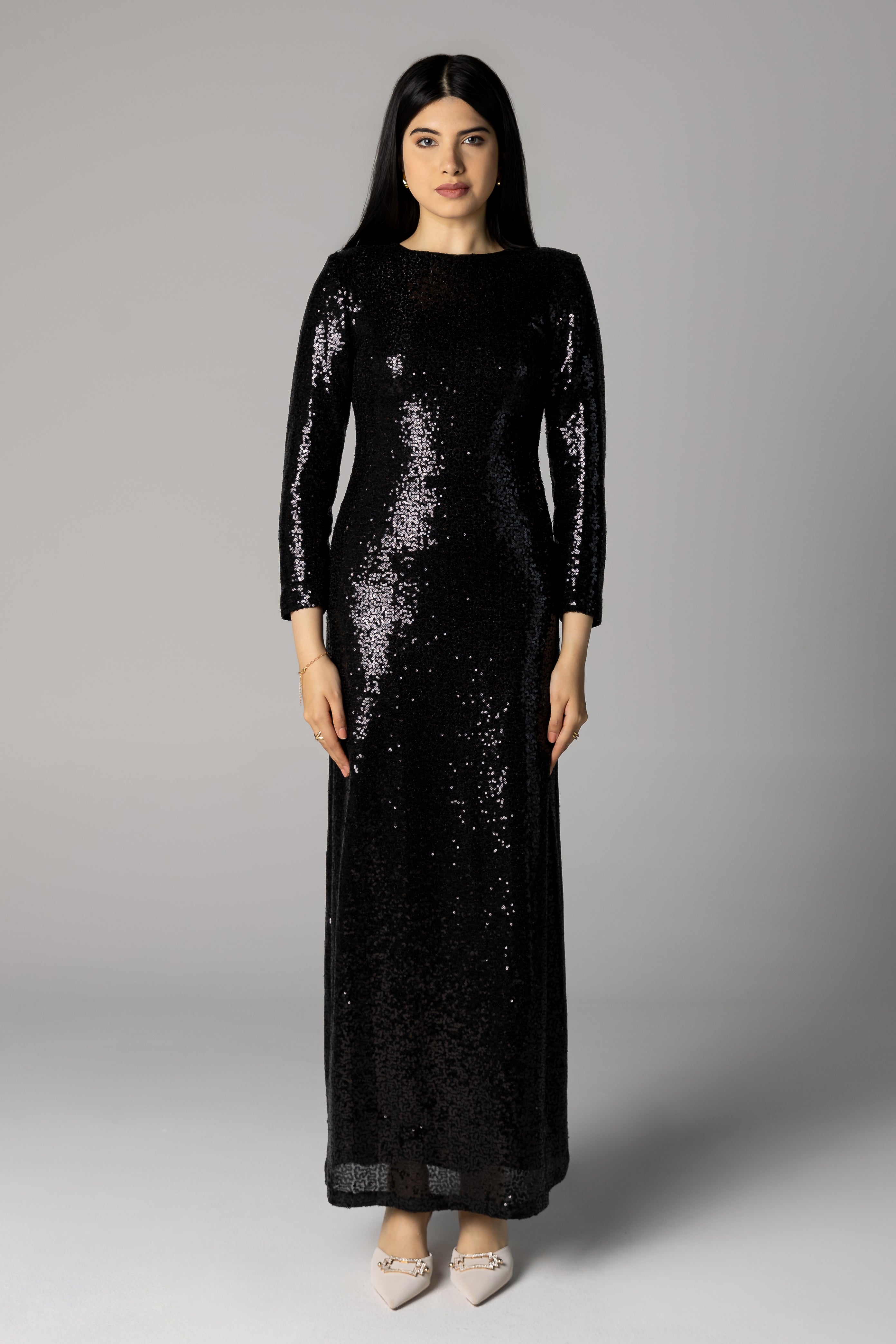 She’s the classic modest evening dress that every wardrobe needs. This dress is flattering in every way on every body type. Order a larger size for a more oversized look or true to size for more shapely one, this sequined dress looks gorgeous either way. Perfect for when you want to look classy and minimalist and jazz your look up with statement accessories. She was made to be styled in countless different ways.