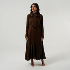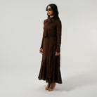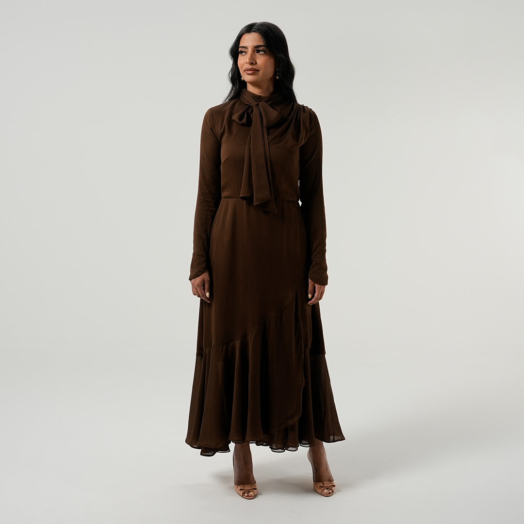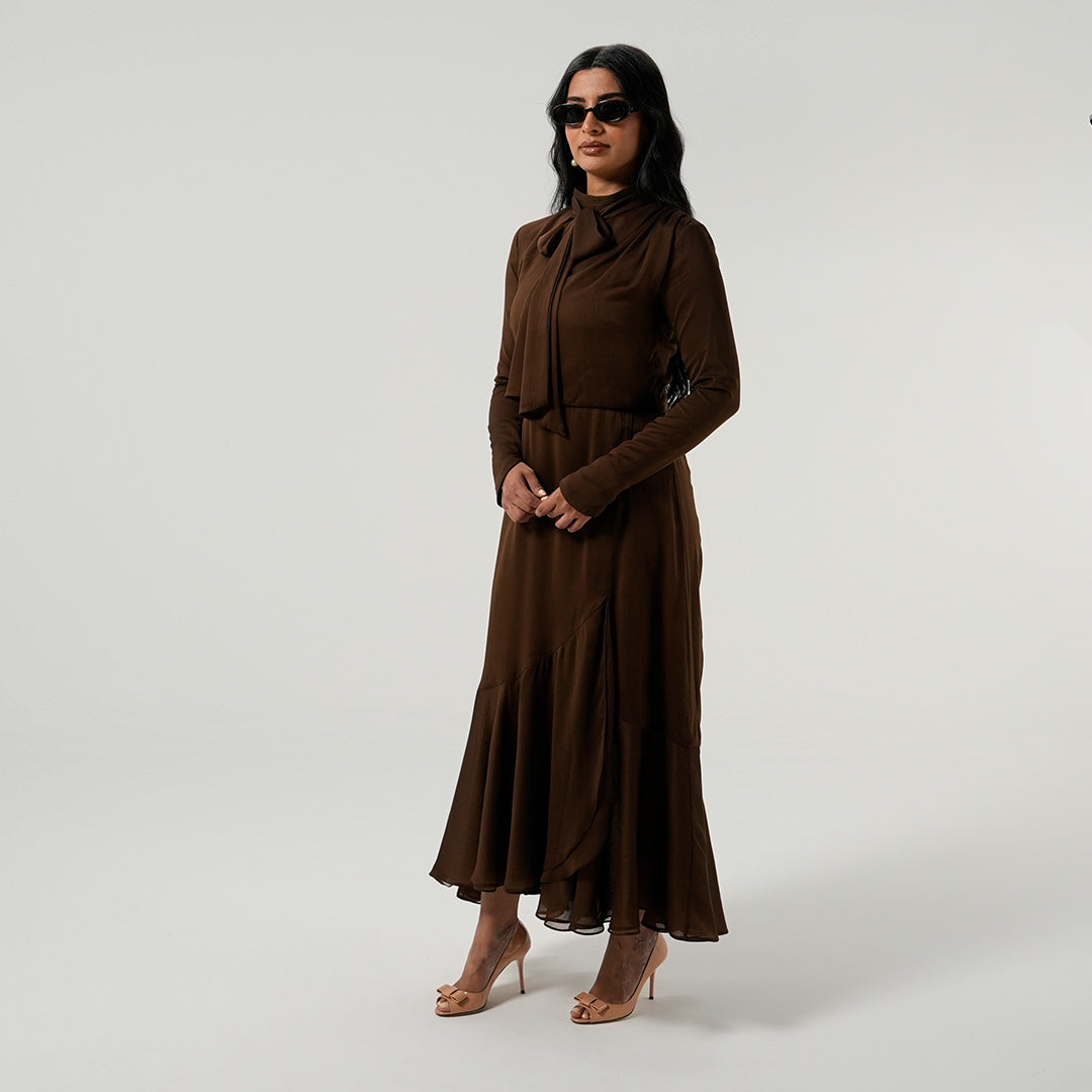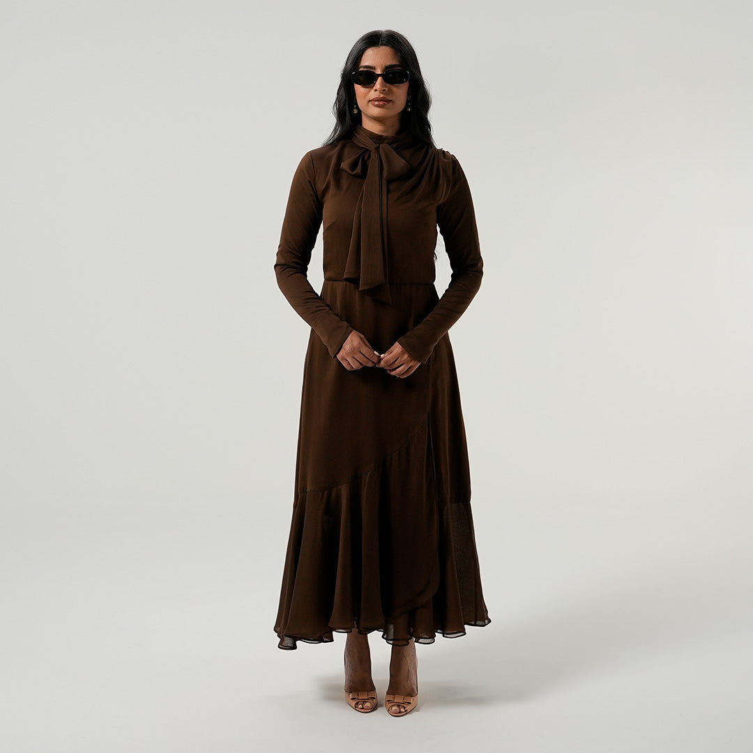 If modest elegance was a dress, this is it. This beauty was created with attention to every detail to be the most seasonless dress on the market. The fabric is the richest chocolate brown to fulfill all your fall dreams. The outfit of the season, it has gathered chiffon on the shoulder and skirt. . This dress can be worn from dusk till dawn and accessorized for the day with your sunnies and for the night with your diamonds. We can’t get enough of this dress and you won’t either.