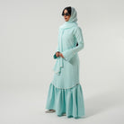 This aqua maxi dress was designed to be modest chic with its stunning peplum skirt and flared cuffs lined with pearls. A dress that invokes a reaction by everybody who sees it, is only elevated with a chiffon scarf also lined with pearls to have the most aesthetic combination of texture and color. Style with pearl or gold accessories to make this look even more iconic.
