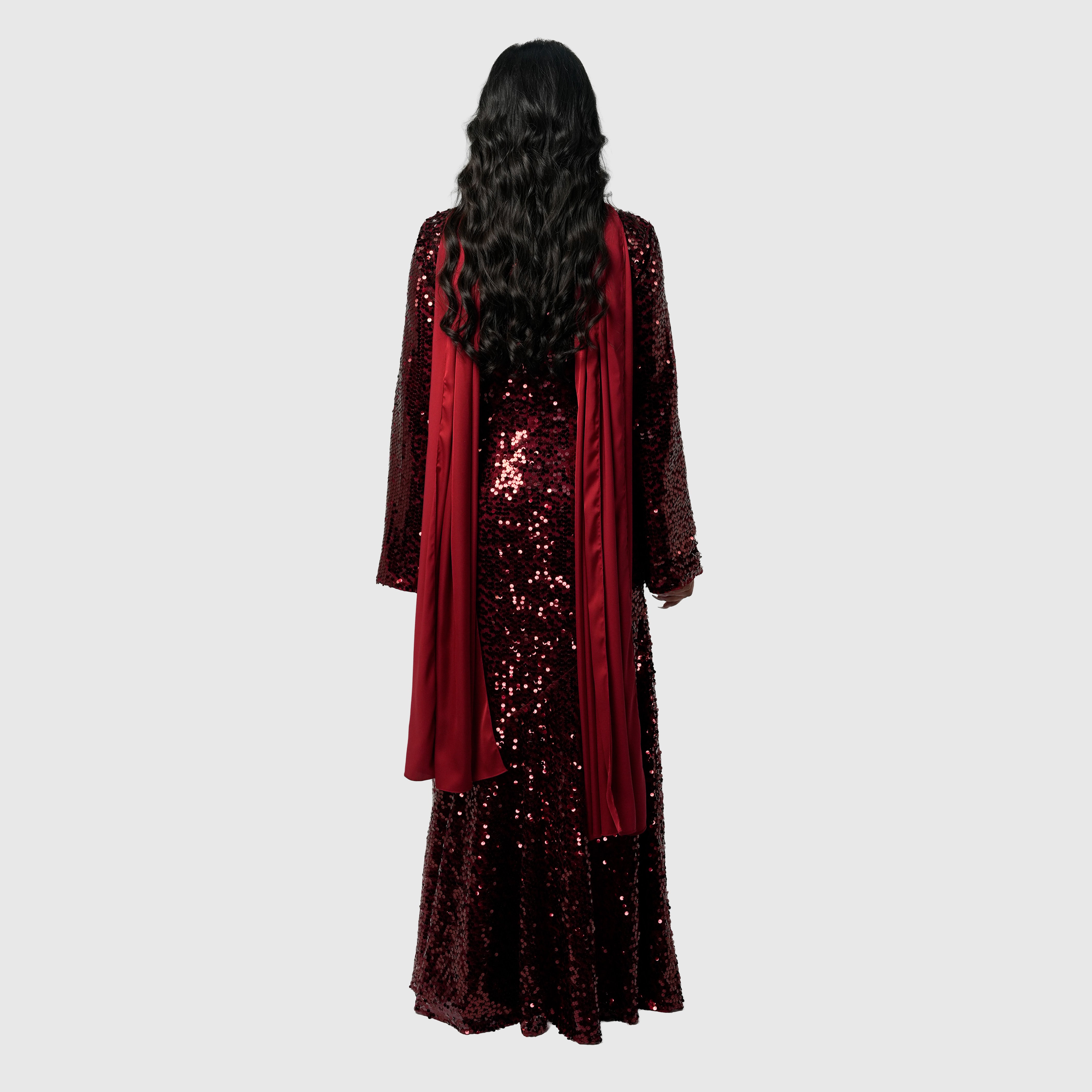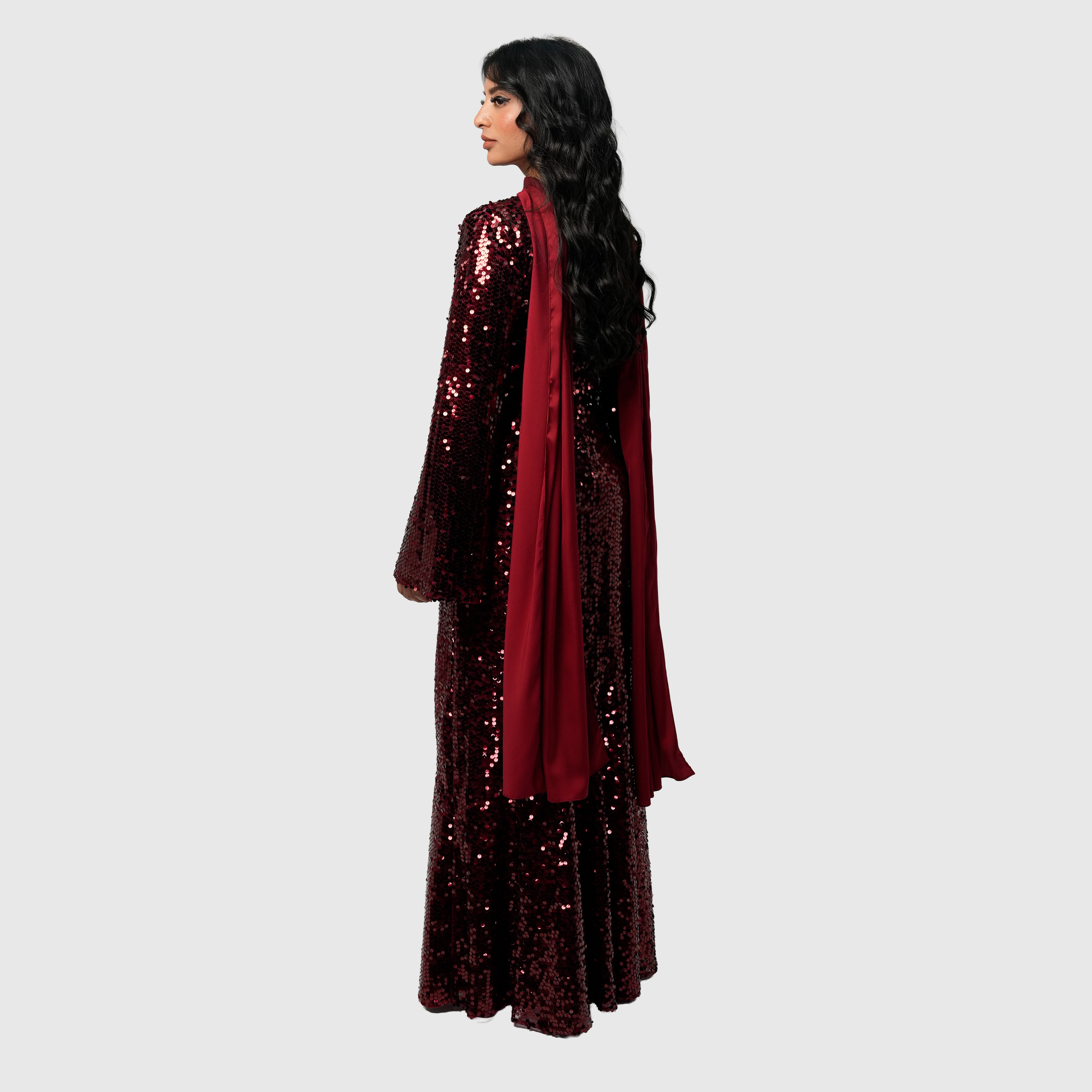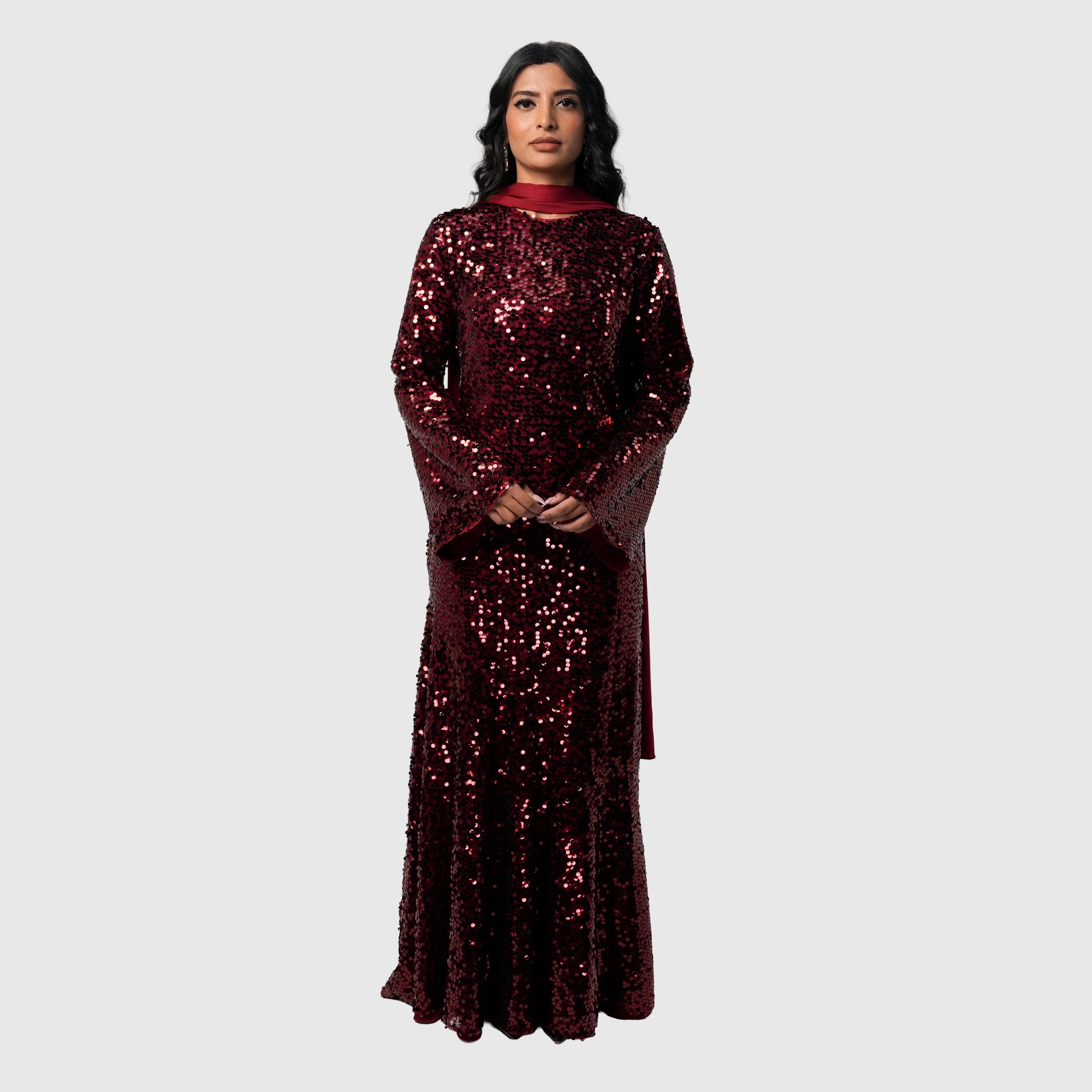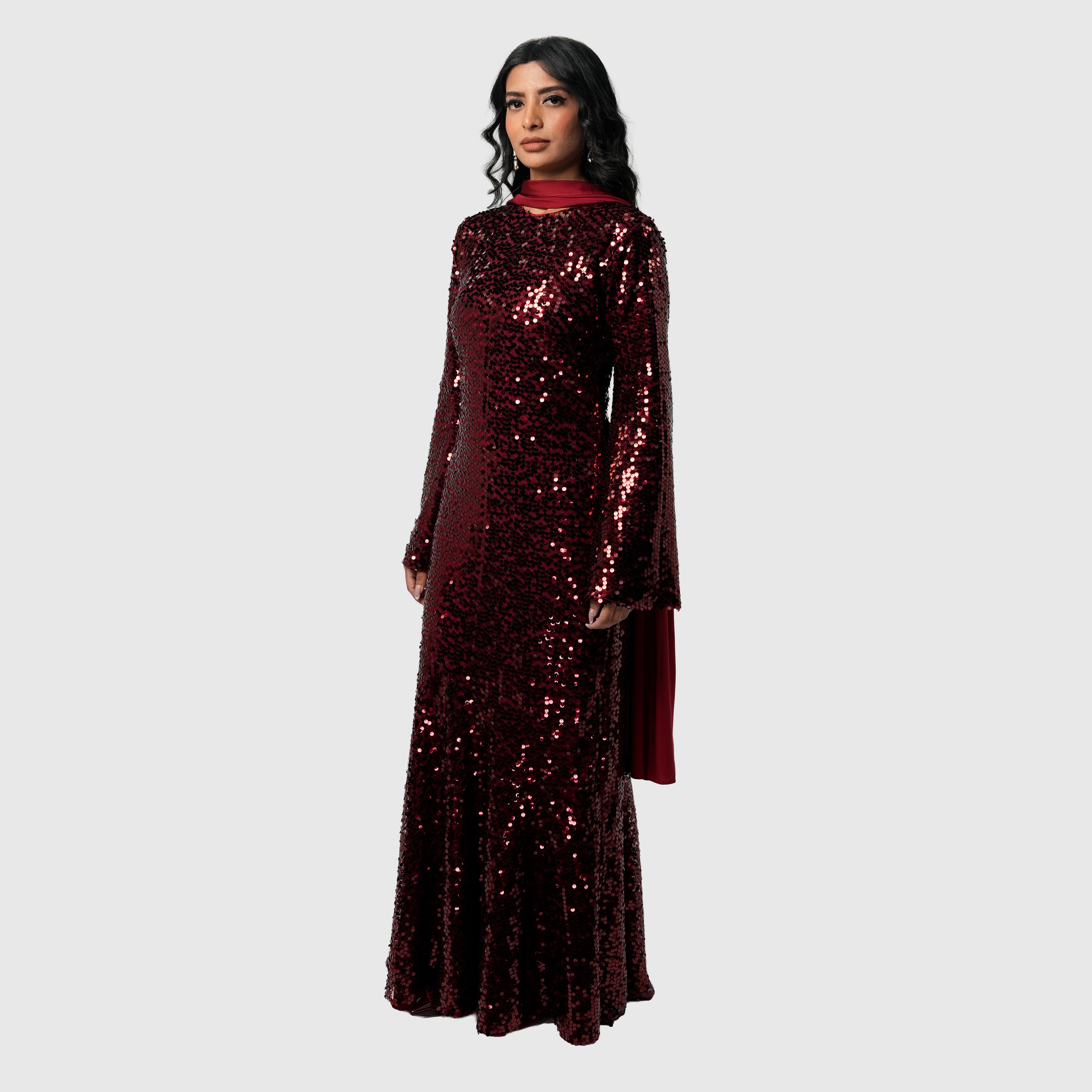 If modest elegance was a dress, this is it. This maroon sequined beauty was created with your special occasions in mind. Graduations, birthdays, weddings, Iftar or Eid, this dress will not fail you because it is that stunning. The outfit of the season, it has a flared peplum skirt which falls ever so beautifully. The satin scarf elevates the dazzling dress giving you a match made in heaven. This dress can be worn from dusk till dawn and accessorized for the day with your sunnies and for the night with your diamonds. We can’t get enough of this dress and you won’t either.