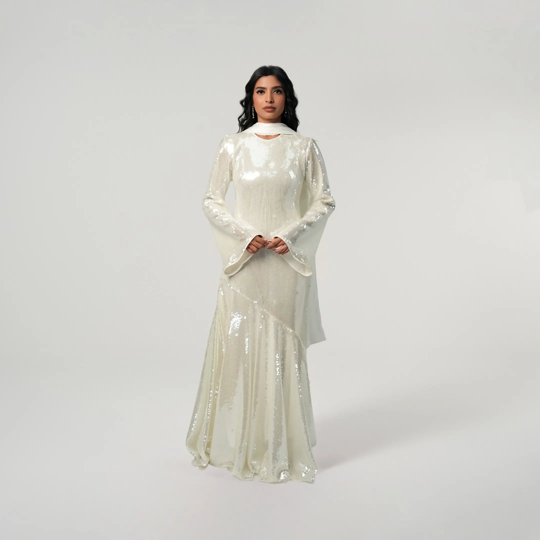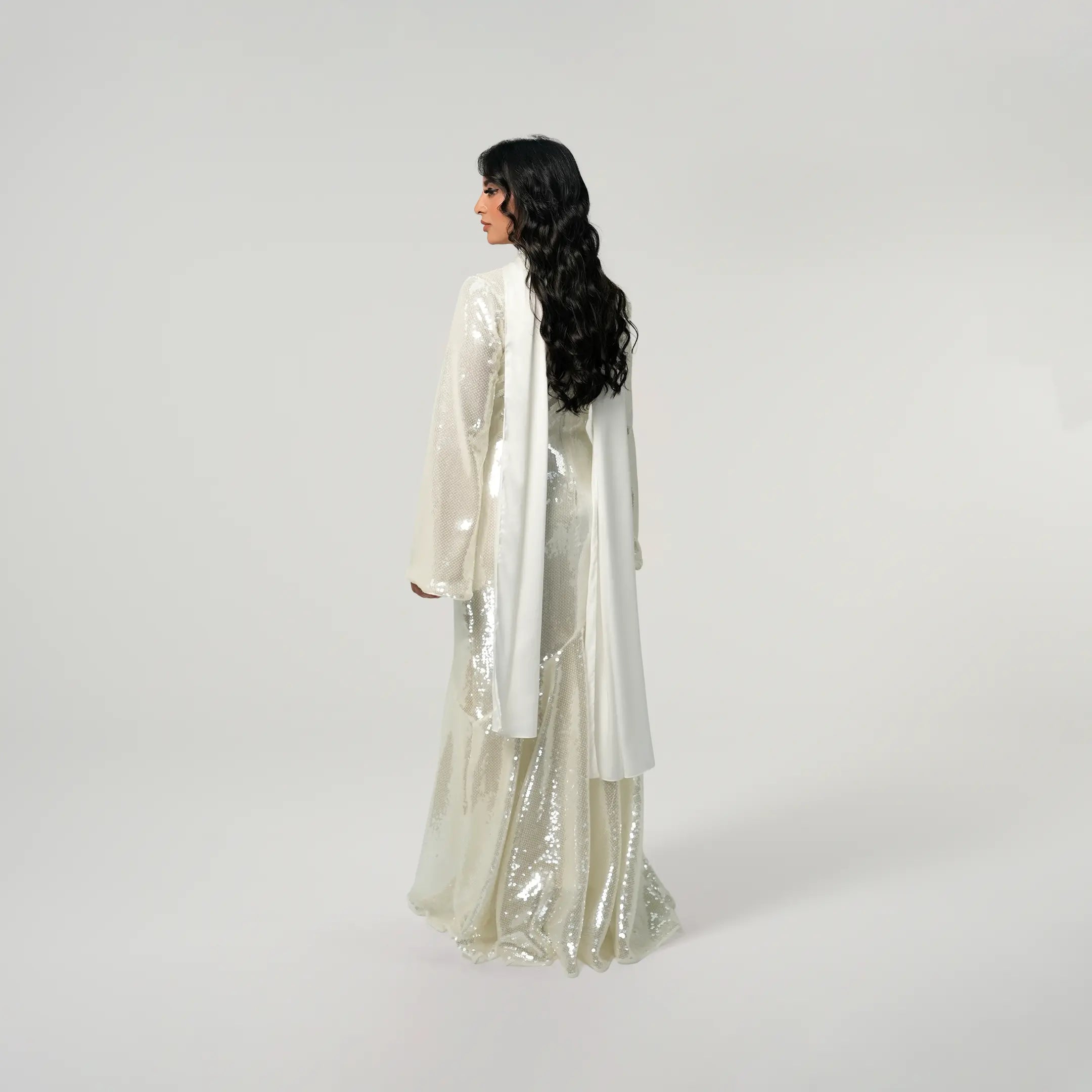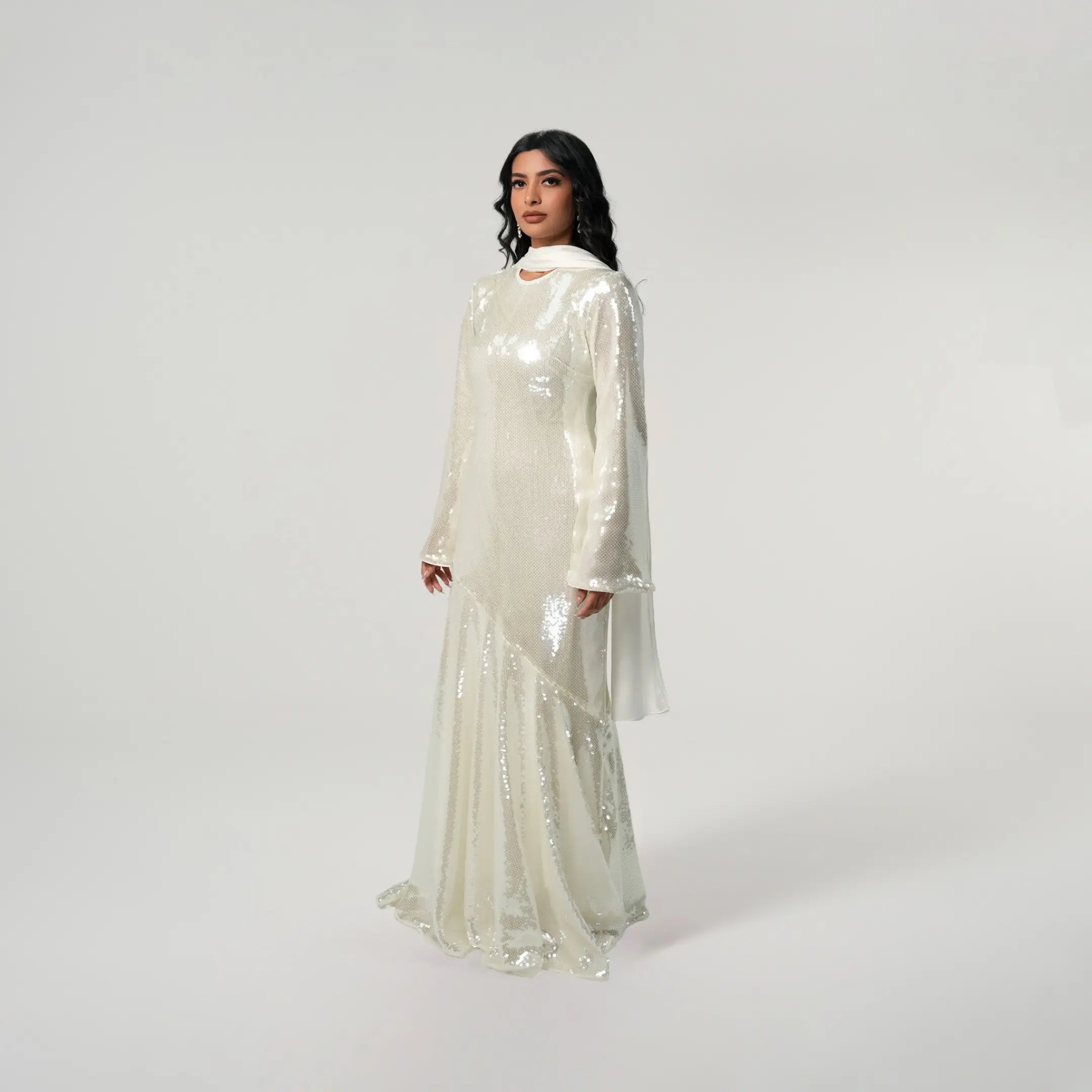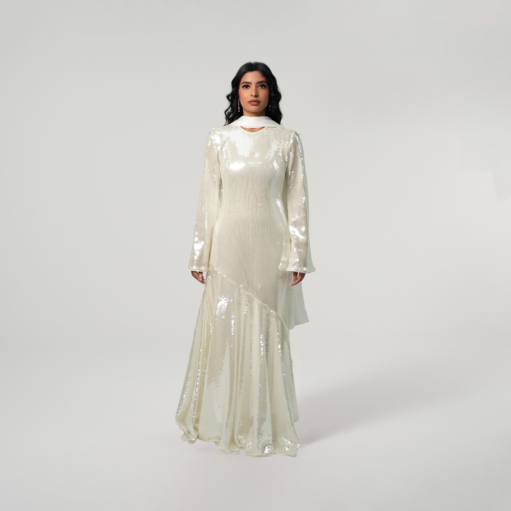 If modest elegance was a dress, this is it. This white sequined beauty was created with your special occasions in mind. Graduations, birthdays, weddings, Iftar or Eid, this dress will not fail you because it is that stunning. The outfit of the season, it has a flared peplum skirt which falls ever so beautifully. The satin scarf elevates the dazzling dress giving you a match made in heaven. This dress can be worn from dusk till dawn and accessorized for the day with your sunnies and for the night with your diamonds. We can’t get enough of this dress and you won’t either.