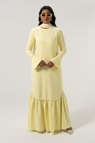 This buttery yellow maxi dress was designed to be modest chic with its stunning peplum skirt and flared cuffs lined with pearls. A dress that invokes a reaction by everybody who sees it, is only elevated with a chiffon scarf also lined with pearls in a paler yellow to have the most aesthetic combination of texture and color. Style with pearl or gold accessories to make this look even more iconic.