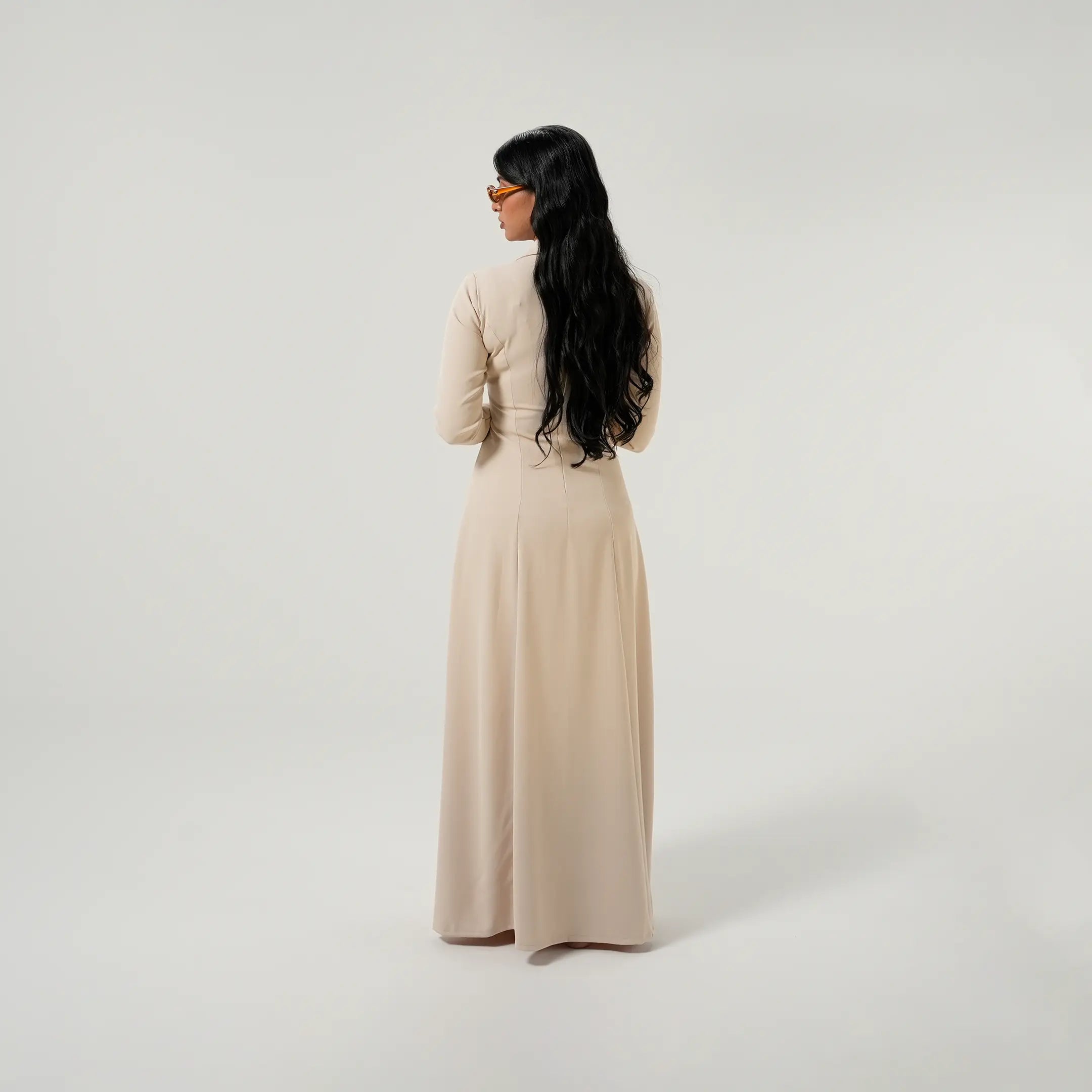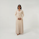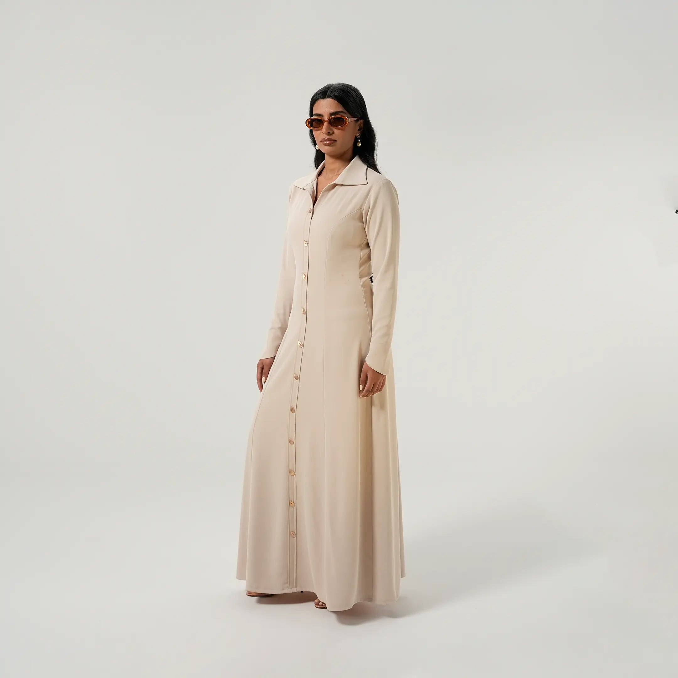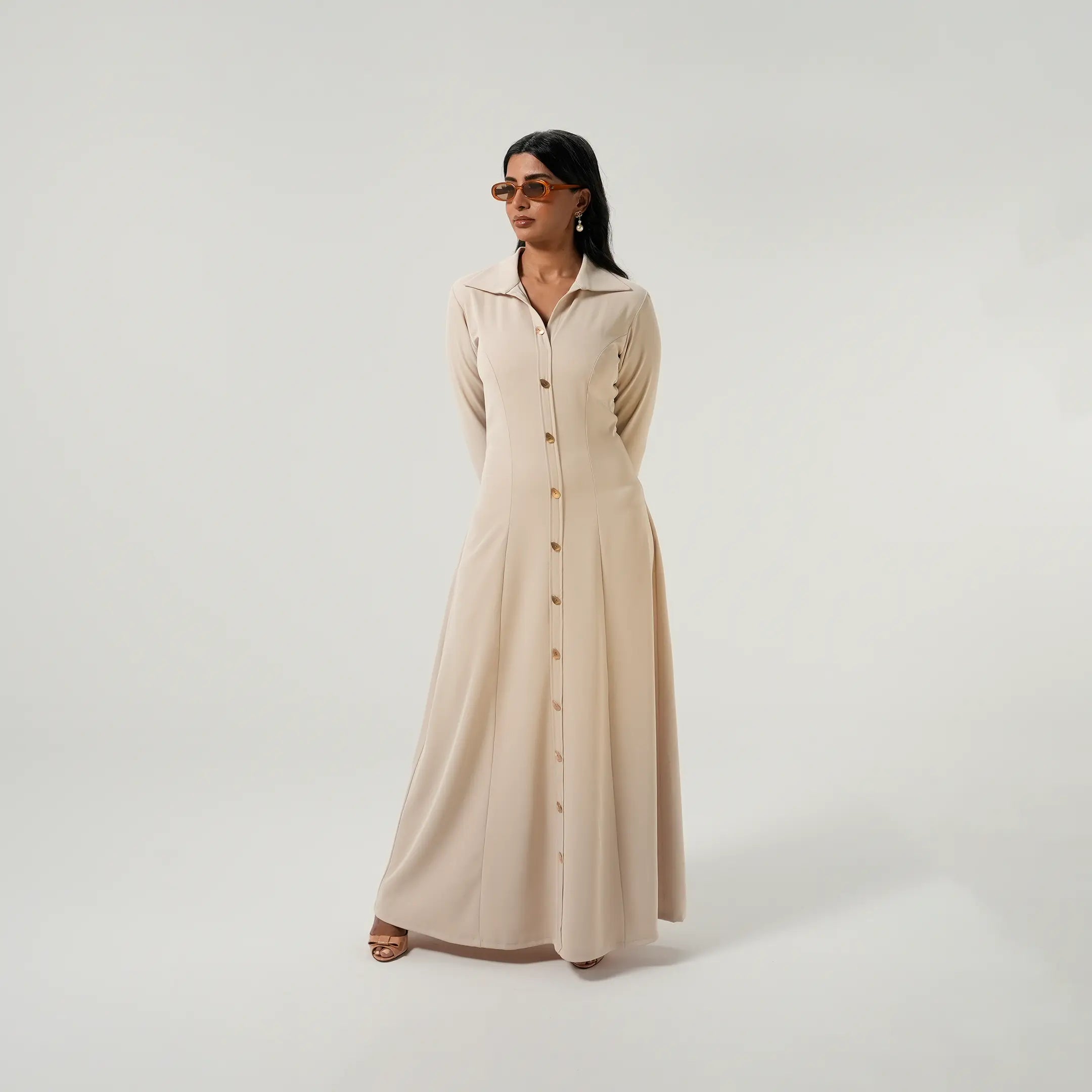 This light beige collared maxi dress is the definition of effortless sophistication. Designed with a softly flared silhouette, unique curved cuffs, and faux gold button detailing, it elevates everyday dressing while remaining endlessly versatile. Polished enough for meetings, refined enough for dinner- this is your ultimate smart-casual staple. Style with gold statement earrings and oversized sunglasses for an effortlessly put-together look.