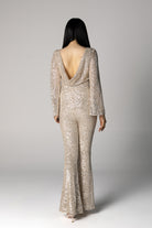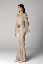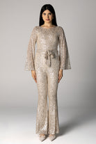 The modest party outfit of your dreams. She’s a glittering champagne golden jumpsuit that comes with a belt to give you a cinched waist. The flared sleeves and trousers are reminiscent of a 60s dance party. The back is draped in graceful cowls to elevate the jumpsuit while remaining classy and elegant. She’s perfect for a party with the girls and is meant to be styled with va-va-voom. Wear her with big hair and statement earrings to get that serious 60s vibe.