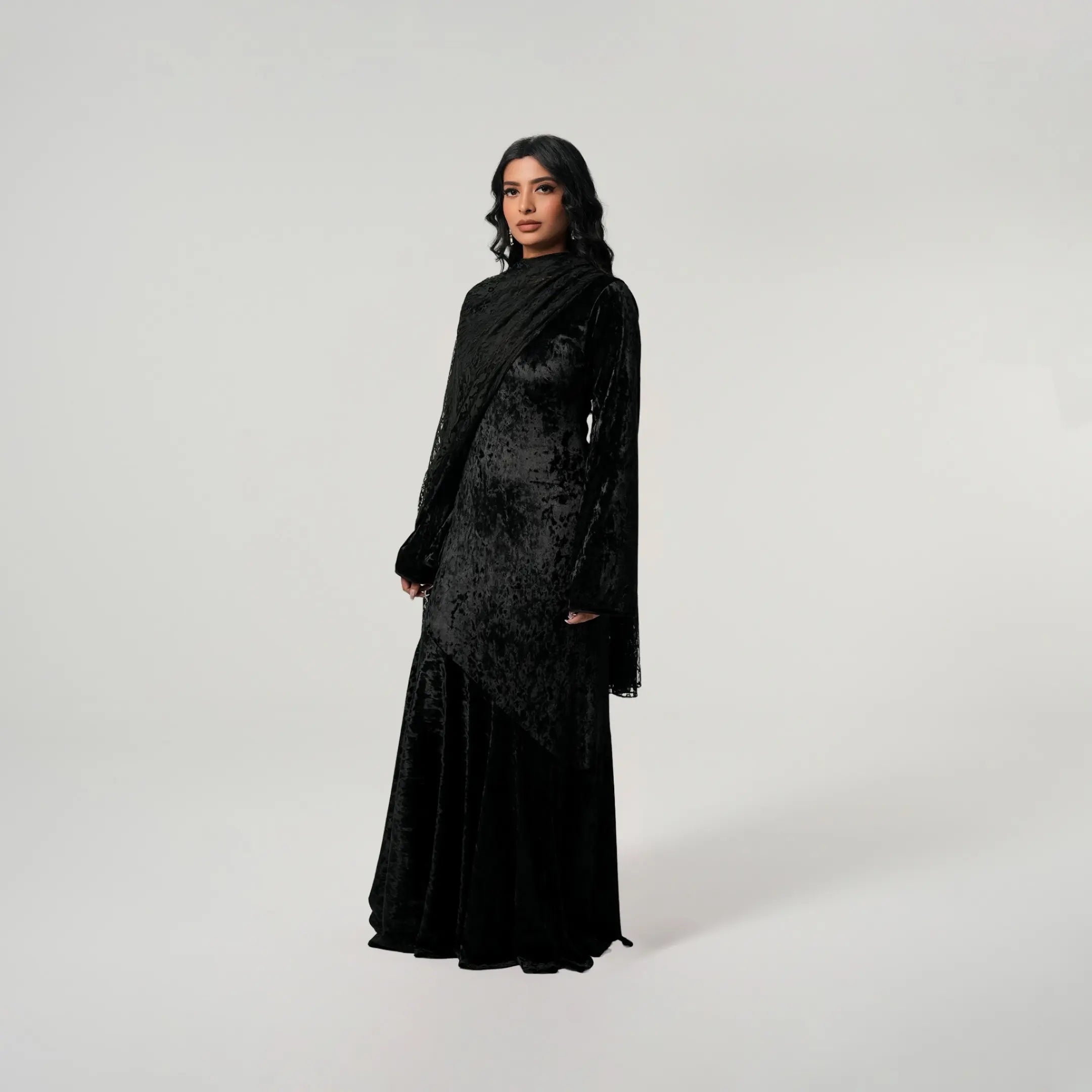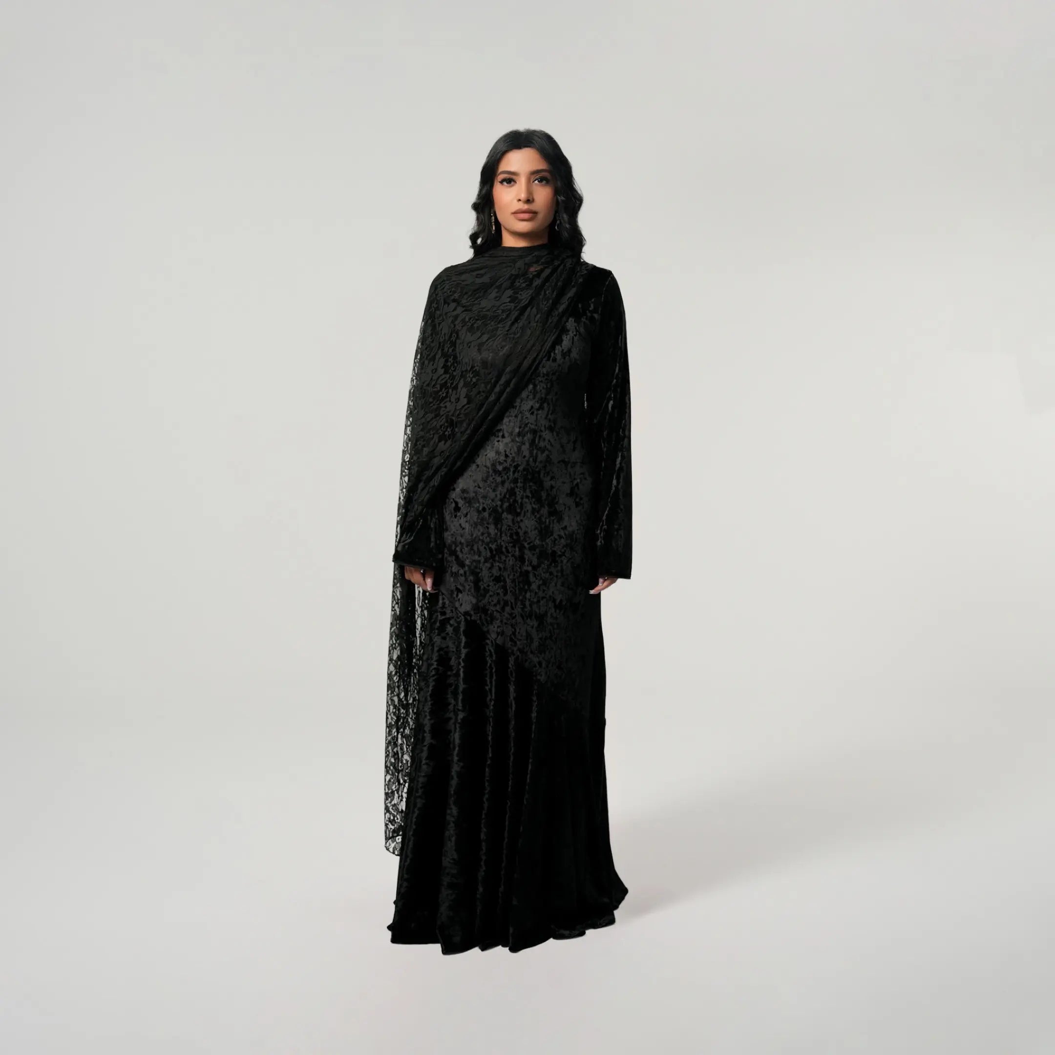 If modest elegance was a dress, this is it. This black beauty was created with your special occasions in mind. Graduations, birthdays, weddings, Iftar or Eid, this dress will not fail you because it is that stunning. The outfit of the season, it has a flared peplum skirt which falls ever so beautifully. The lace scarf elevates the velvet dress giving you a match made in heaven. This dress can be worn from dusk till dawn and accessorized for the day with your sunnies and for the night with your diamonds. We can’t get enough of this dress and you won’t either.