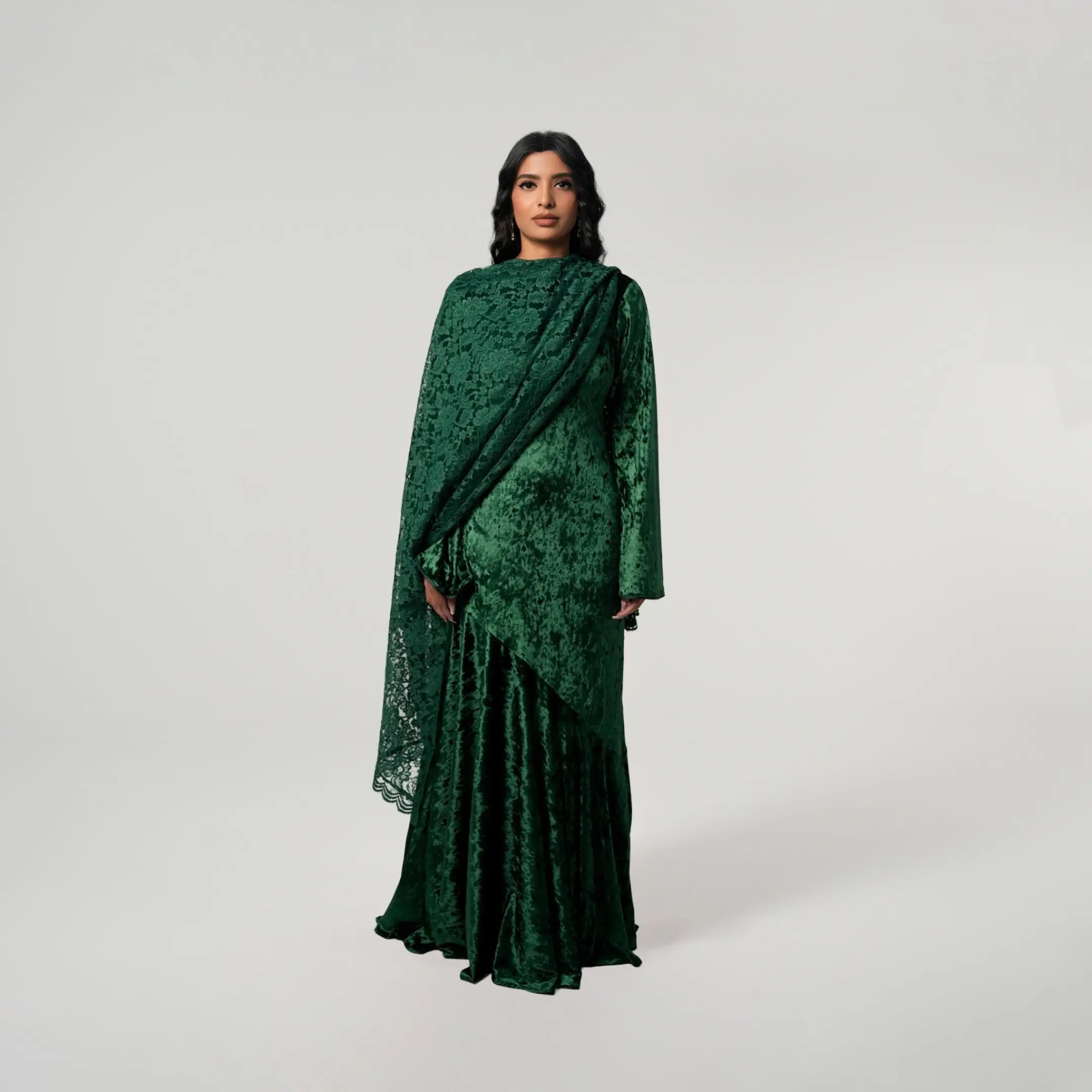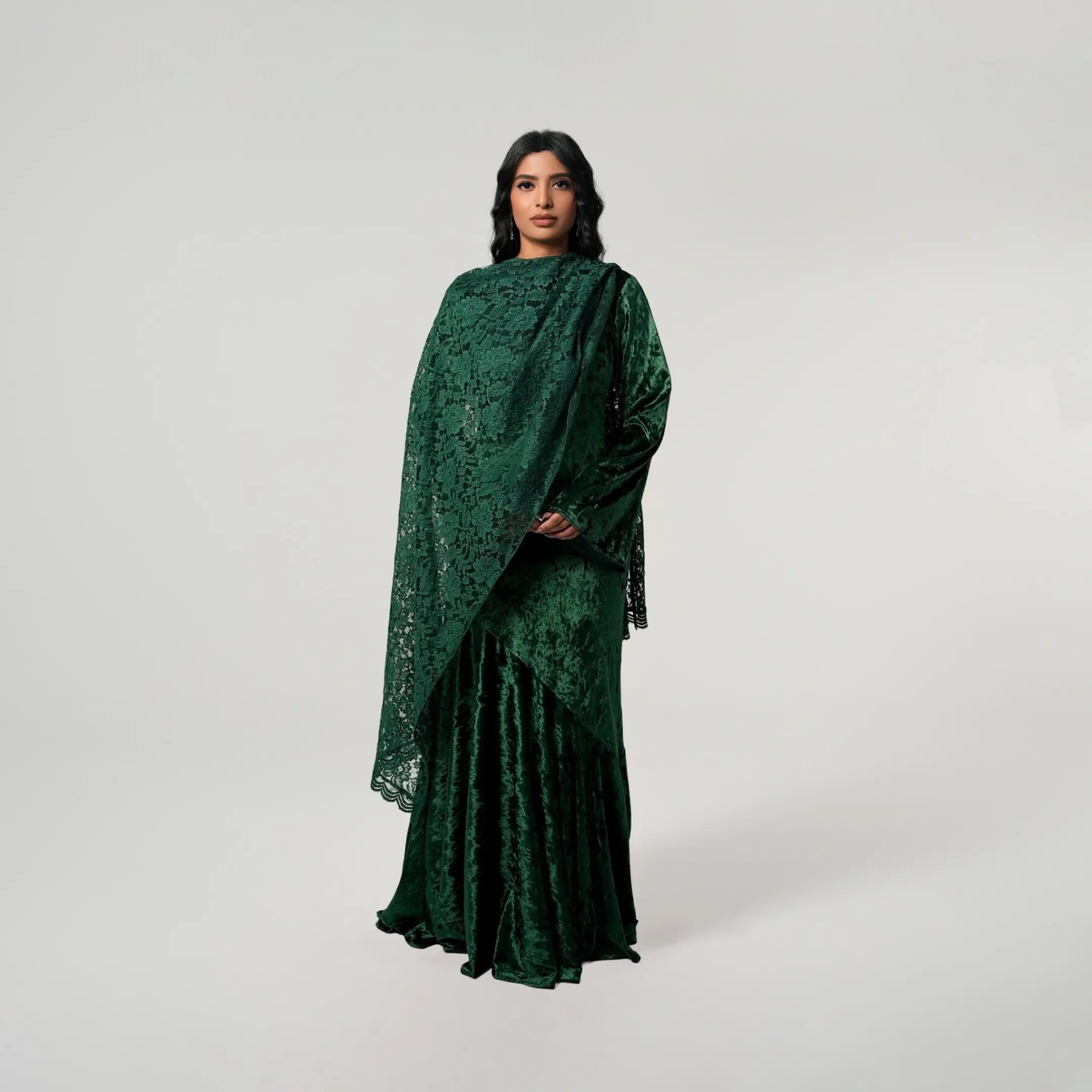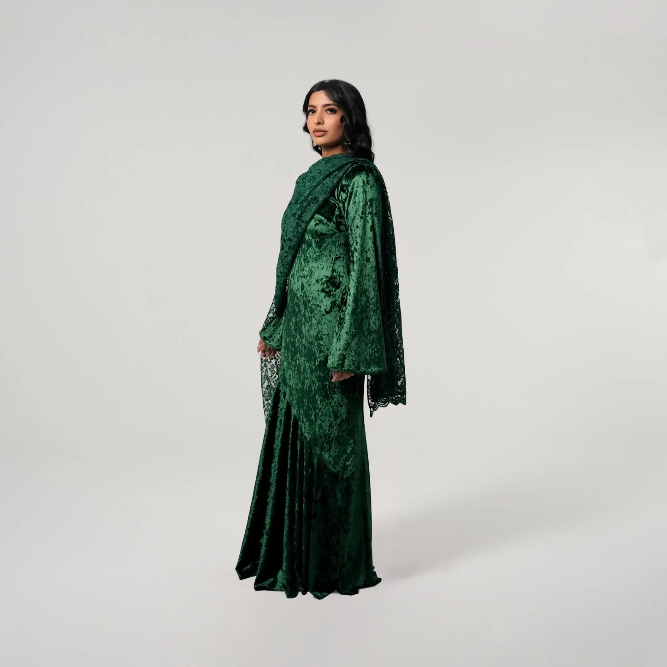 If modest elegance was a dress, this is it. This forest green beauty was created with your special occasions in mind. Graduations, birthdays, weddings, Iftar or Eid, this dress will not fail you because it is that stunning. The outfit of the season, it has a flared peplum skirt which falls ever so beautifully. The floral lace scarf elevates the velvet dress giving you a match made in heaven. This dress can be worn from dusk till dawn and accessorized for the day with your sunnies and for the night with your diamonds. We can’t get enough of this dress and you won’t either.
