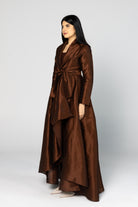 This chocolate brown robe was designed with minimalist luxury in mind. She’s made in a crisp raw silk that has a gleamy appearance to elevate the classic design. The graceful and subtle stiffness of the fabric allows the dress to appear full and voluminous waist down. The dress is a shorter length in the front to allow ease in walking and longer in the back so that it billows out while you glide through the evening. Get creative with how you tie the long belt to give yourself a tighter or more relaxed cinch at the waist.